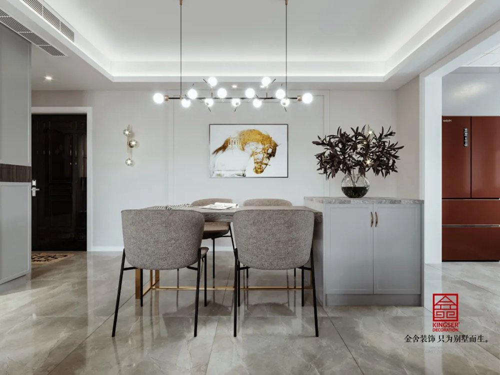 干凈明亮的餐廳空間借由藝術特質,有著一氣呵成的輕奢氣派,石材、布藝及金屬等多樣的材質運用使得空間靈動而不失活潑。