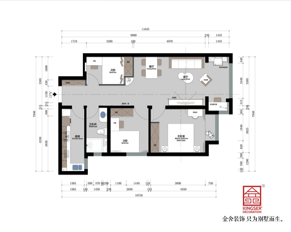 2.新建隔墻實現三室需求并滿足餐邊柜功能需求。