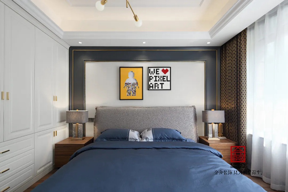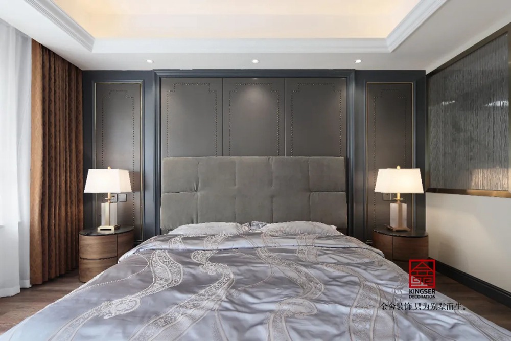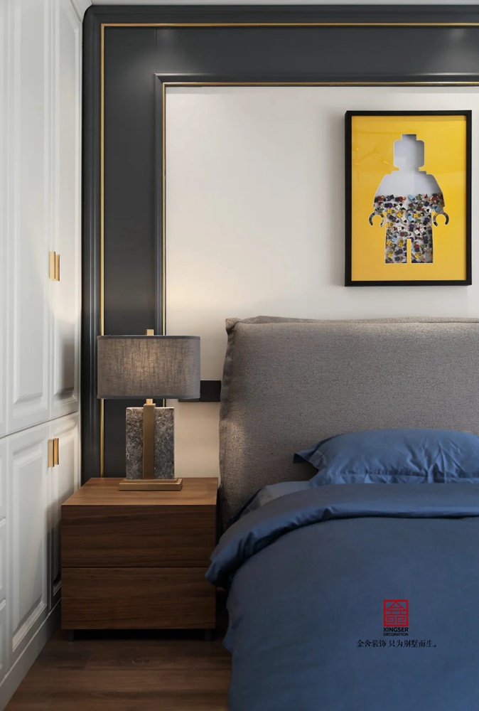 臥室都以溫潤的木頭地板舖陳,為空間增添柔軟的生活感,金屬床頭吊燈點綴素雅空間,帶來輕奢舒眠感。灰色布藝的軟包床頭是本案的設計亮點,搭配精品家私展現空間獨特質感。