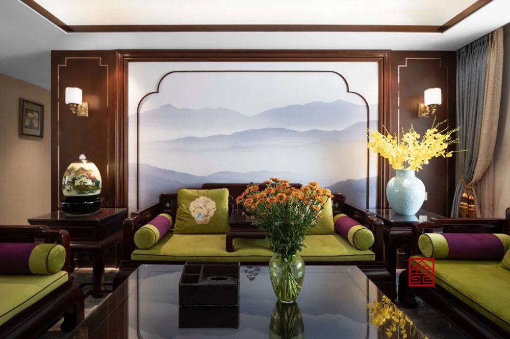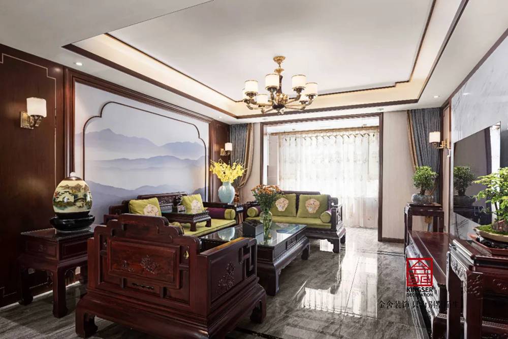 定格的新綠,散開在空間之中,深棕色的中式風縈繞在整個客廳之內,家居的設計吸取傳統文化內涵為設計元素,革除傳統中式家具笨重的弊端,廢棄多余的雕刻,糅合現代居室的舒適感。