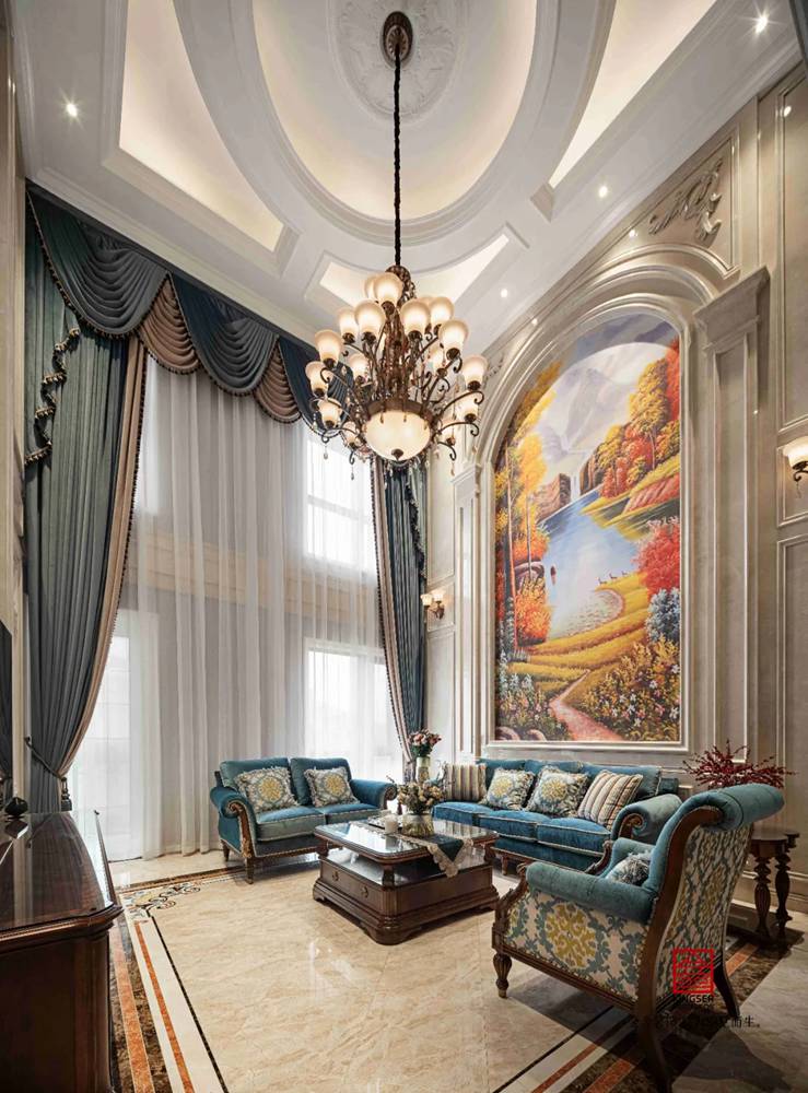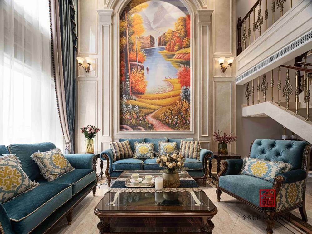 客廳以濃厚的懷舊感情和大膽的革新精神對歐式古典語匯作了新的闡釋,以極度的挑高加上典雅的家居配飾,把高雅的古典情趣和精巧的浪漫主義聯系在一起,復活了歐式風格的精魄。同時在營造歐式風格的氛圍時,以一些有特色的軟裝點綴,比如深色的實木家具,色彩鮮艷的布藝沙發,都是歐式客廳里的主角。自然垂落的窗幔、精美的壁畫……仿佛置身于歐洲宮廷,高貴奢華油然而生。