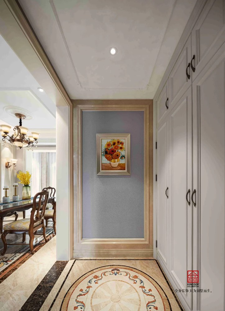 門廳位置透過設計師的設計來凸顯歐式的純然風情及深厚的文化底蘊,走廊間色調柔和,給人高貴舒適的感受,地面拼花為簡潔的地板起點綴作用,梵高的向日葵掛畫彰顯業主品位。