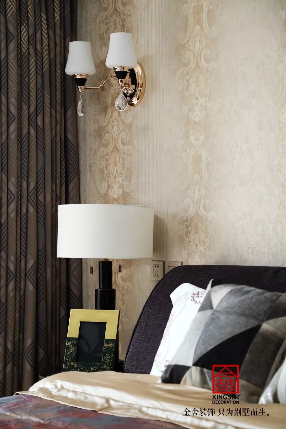 設計說明:此案例為石家莊金舍裝飾-國富華庭180平米現代簡約裝修實景。黑白相配的吊燈,半亞光迷彩感十足的床品配合黑色時尚的軟床呈現豐富的層次感,在陽光的映襯下呈現出一個充滿溫馨與質感的空間,床上的金色飾品將房子的格調瞬間提升了起來。