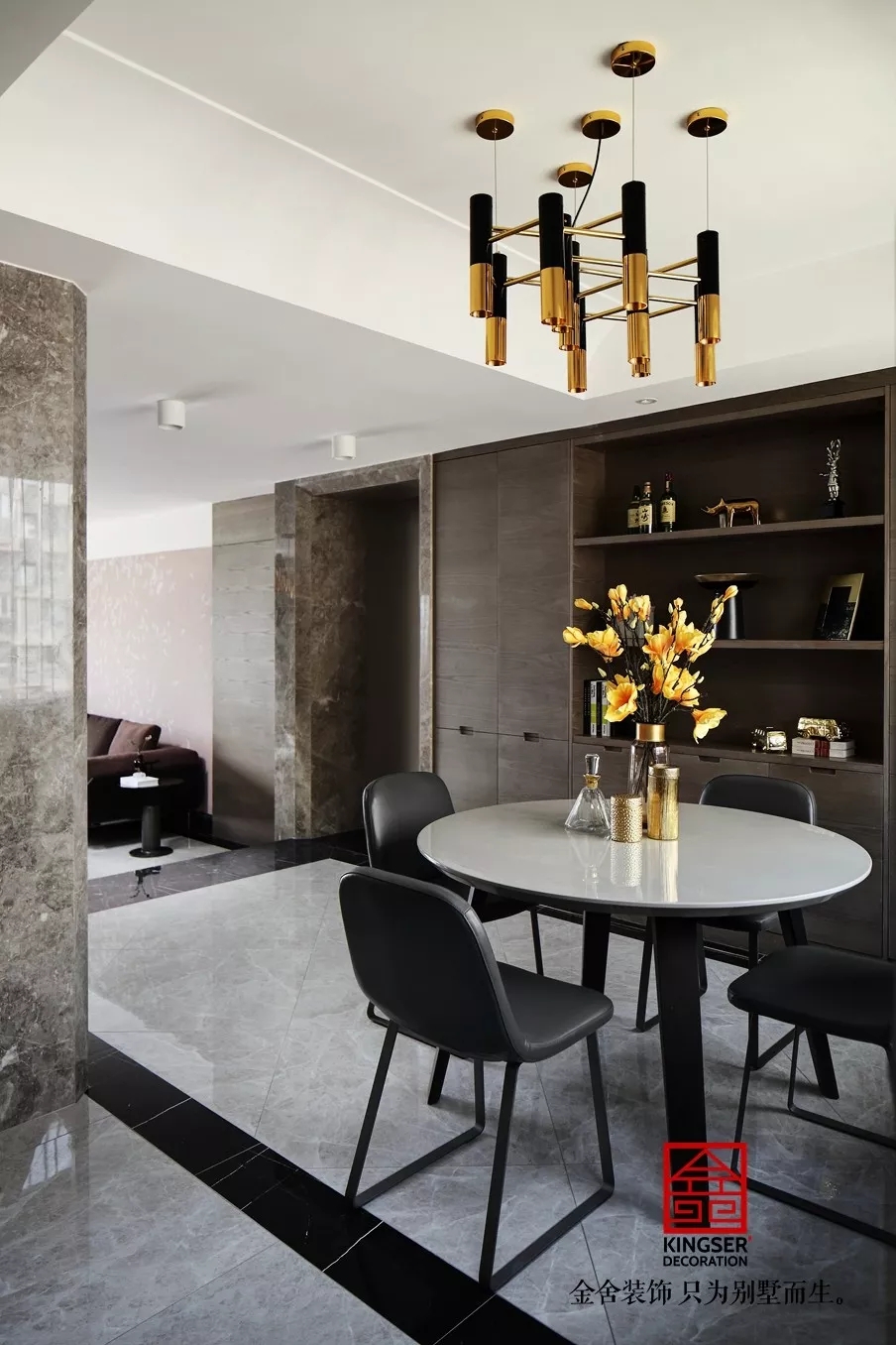 深灰色石材墻面質感一流,細看之下,絲絲細紋應和著大理石紋理的律動感,貴雅不張揚。搭配造型極簡的黑色茶幾與金黑色現代造型的吊燈,極簡之風呼之欲出。于精致的高級灰色空間中,深咖色的沙發越發跳脫,令空間質感十足,魅力爆棚。