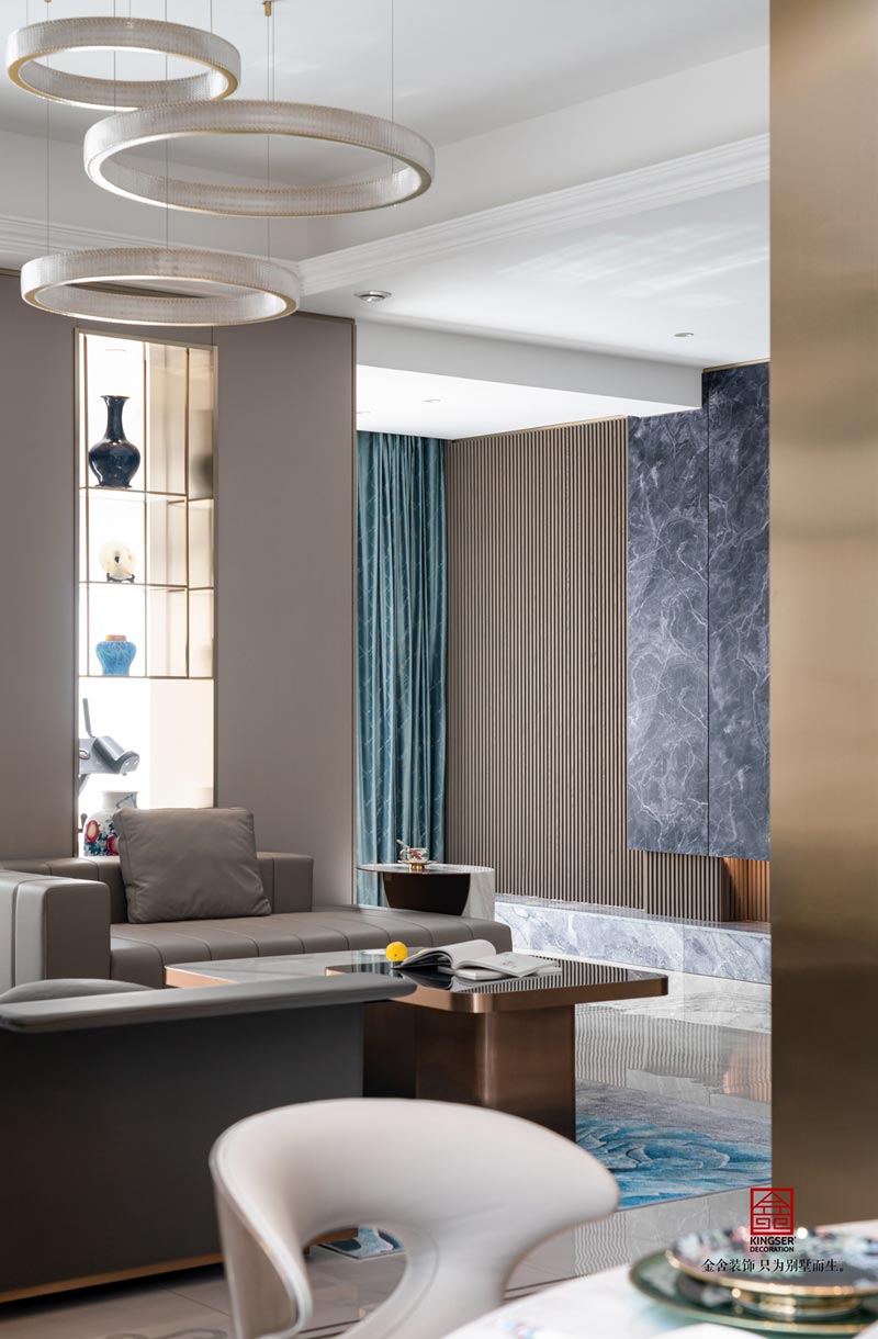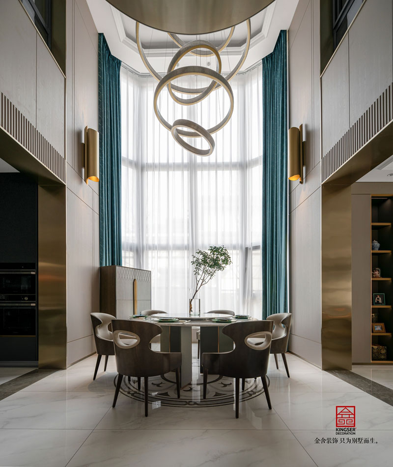 本案對于材質和色彩的運用十分的考究,在空間的塑造上多采用整體結構的重塑,用低飽和度的色彩營造出低調奢華的空間氛圍,構建出整體空間的和諧之美。巨大的挑空空間將整個別墅的空間感完美的拉伸了起來,圓形嵌套式的金屬燈就好像空間中的巨大圖騰,讓人們看到一種莫名的震撼。