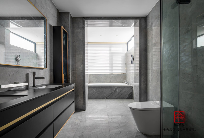衛浴間在設計上以瓷磚為主。灰色大理石紋理,在花紋、款式上達到了統一,再次印證了——顏色搭配也是需要精心設計的。金屬線條的浴室柜,將整體的顏色一下子烘托了出來。