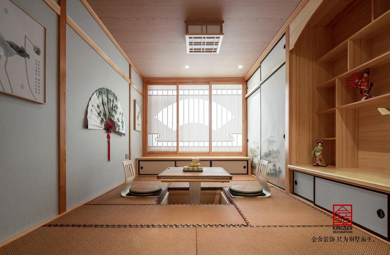 “茗香縈繞群賢來,流觴曲水落花去。”中式的茶室并沒有破壞整體的協調感,中式茶臺,半圍合的琴室,和極具中國風味的庭院,都在一定程度上凸顯出新中式的韻味,古典而優雅。