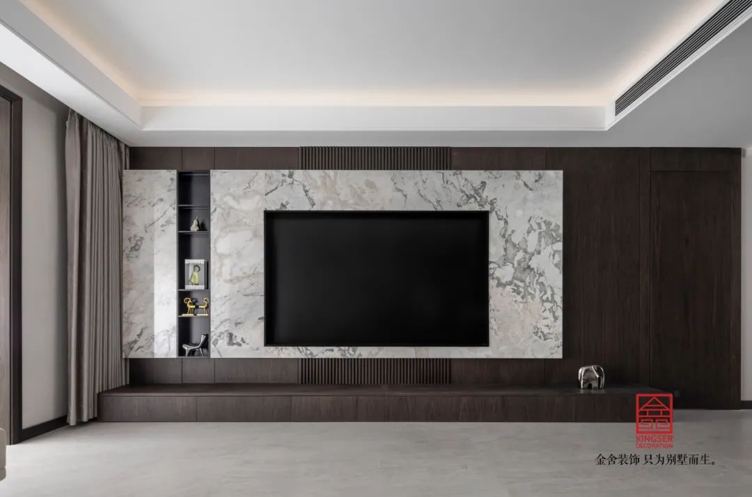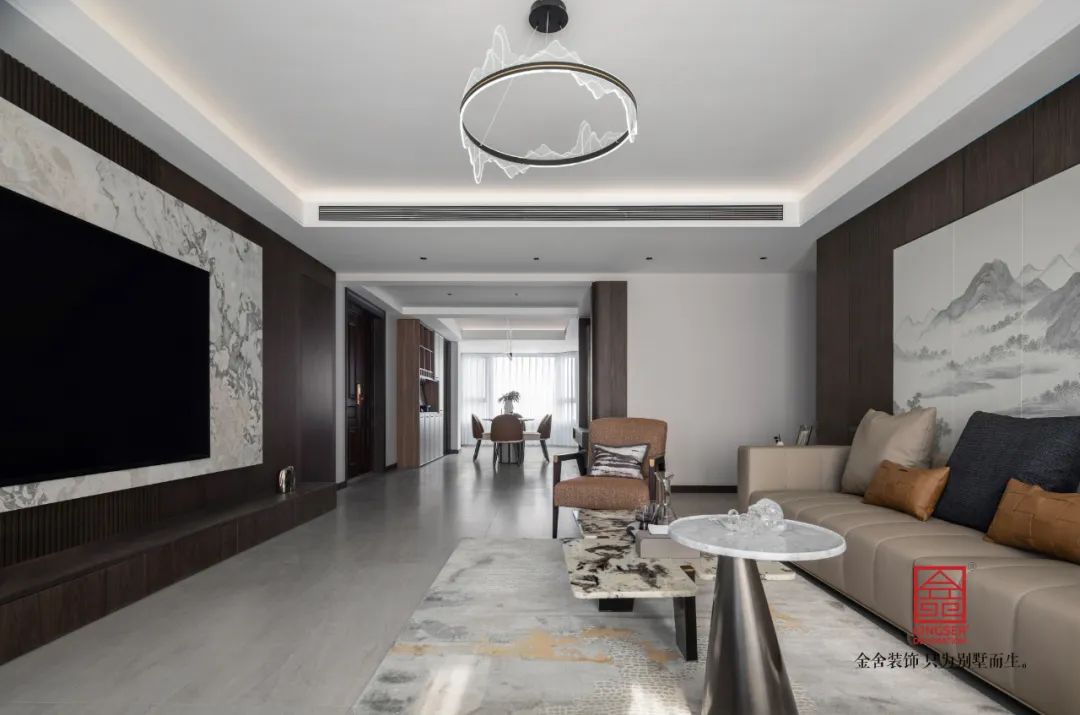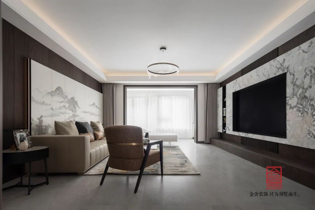 深色的墻板與大理石的配合,讓兩種不同明暗的材質在同一空間出現激情的碰撞,明暗蜿蜒的大理石紋理,也讓整個空間出現了一種流動感。沙發背景墻采用水墨山水的背燈硬包,讓空間增加了一份東方意味。
