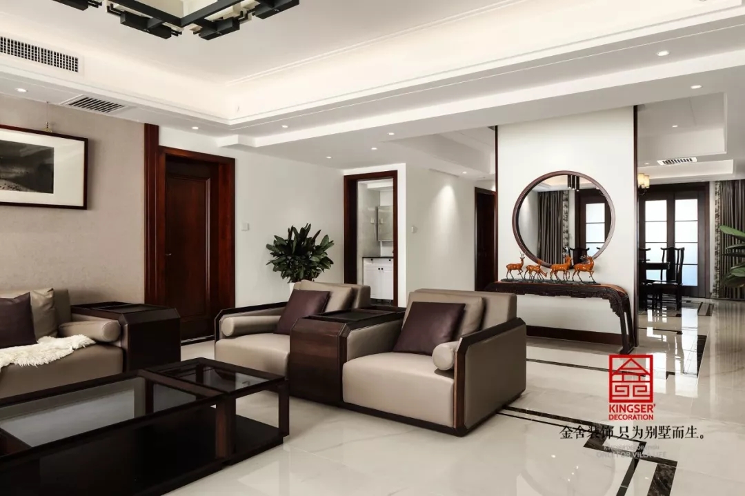 本案例為石家莊金舍裝飾-正定小區206平米中式風格裝修實景。定位新中式風格,客戶要求簡單、時尚,輕裝修重裝飾,體現現代人的生活模式的同時可以蘊含中國東方儒雅氣度。在家具形態上更加簡潔清秀,空間配色上也更為輕松自然。
