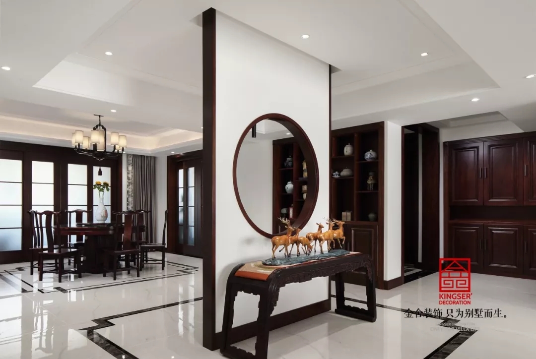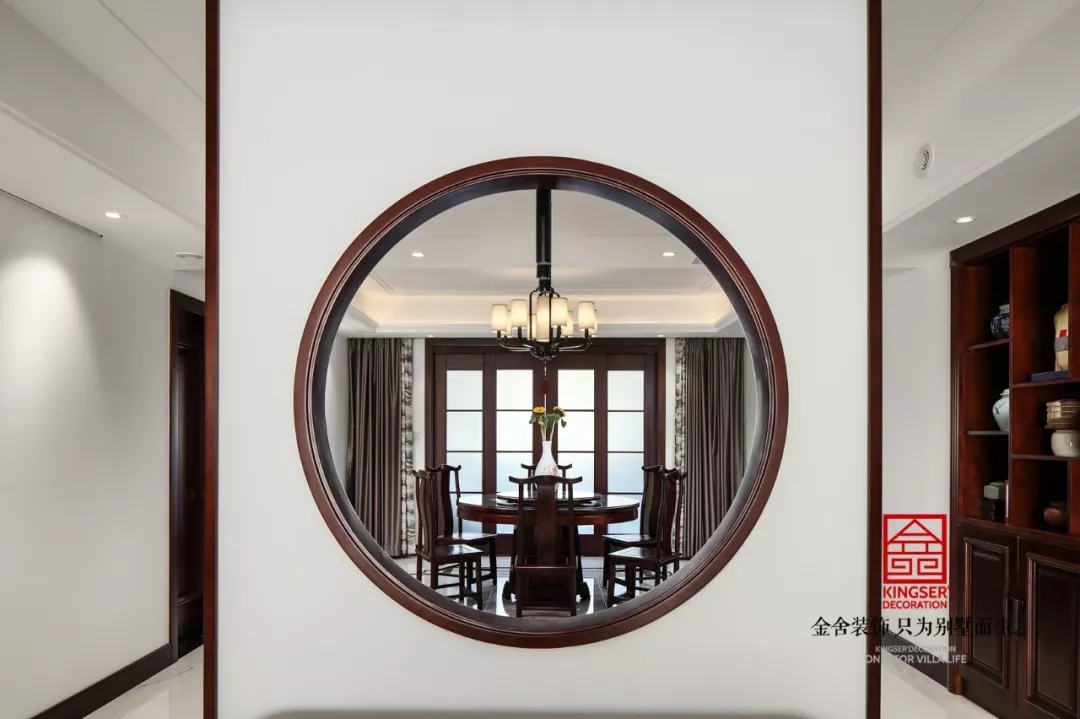 圓形框景手法借此框得景,既保留傳統的味道,又將古代園林構景手法融入其中,讓傳統元素在現代背景下的演繹,整個空間氛圍典雅而不乏時尚,體現出現代人對高雅居住環境的追求。