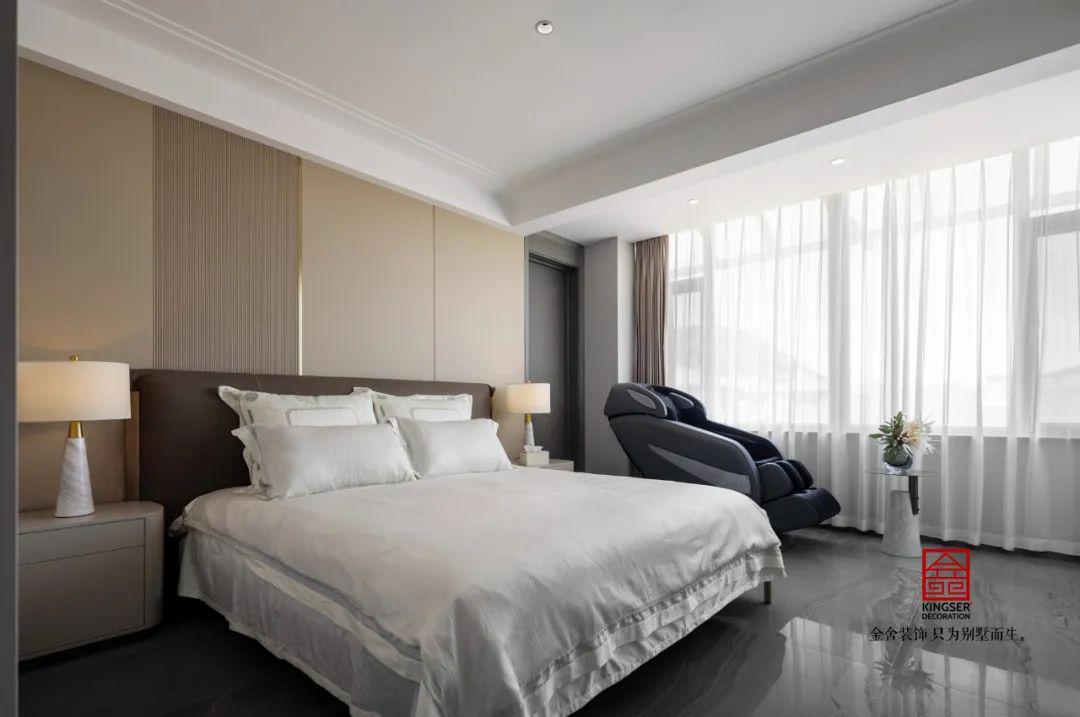 二樓通過功能分區(qū)實現(xiàn)臥室空間的最大化利用,主臥采用雙床錯位布局提升睡眠舒適度,床頭背景墻以水波紋理裝飾營造沉浸式睡眠氛圍。內(nèi)部獨立設(shè)置桑拿房與休閑陽臺,通過玻璃隔斷實現(xiàn)干濕分離,既滿足養(yǎng)生需求又延伸休閑功能。