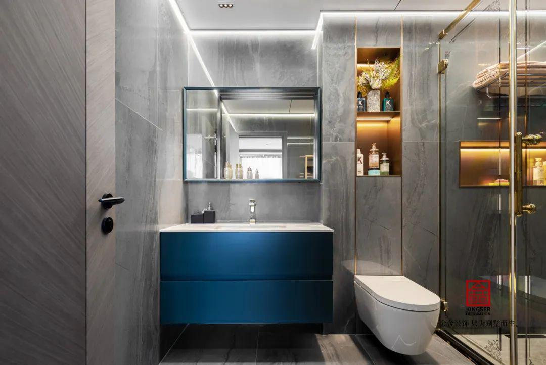 木墻板與大理石的穿插,克萊因藍(lán)的桌椅也是讓整個空間獻出一種青春的氣息,圓形的餐桌,簡單的吊燈,生活的意趣隨時都充滿整個空間。