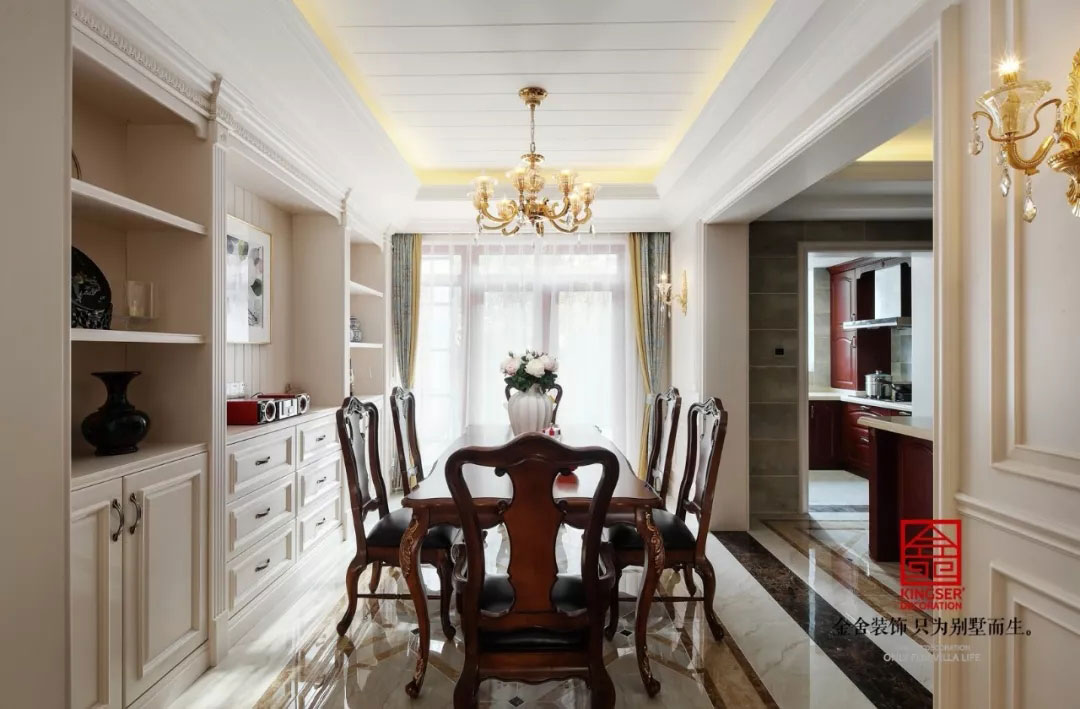 不再拘泥于平面,而是用高低差來做出空間的變化,使空間出現錯落感。餐廳半開敞的設計很有西式廚房的風格,餐廳金色的歐式吊燈融入復古元素,鐫刻著奢華與精美。