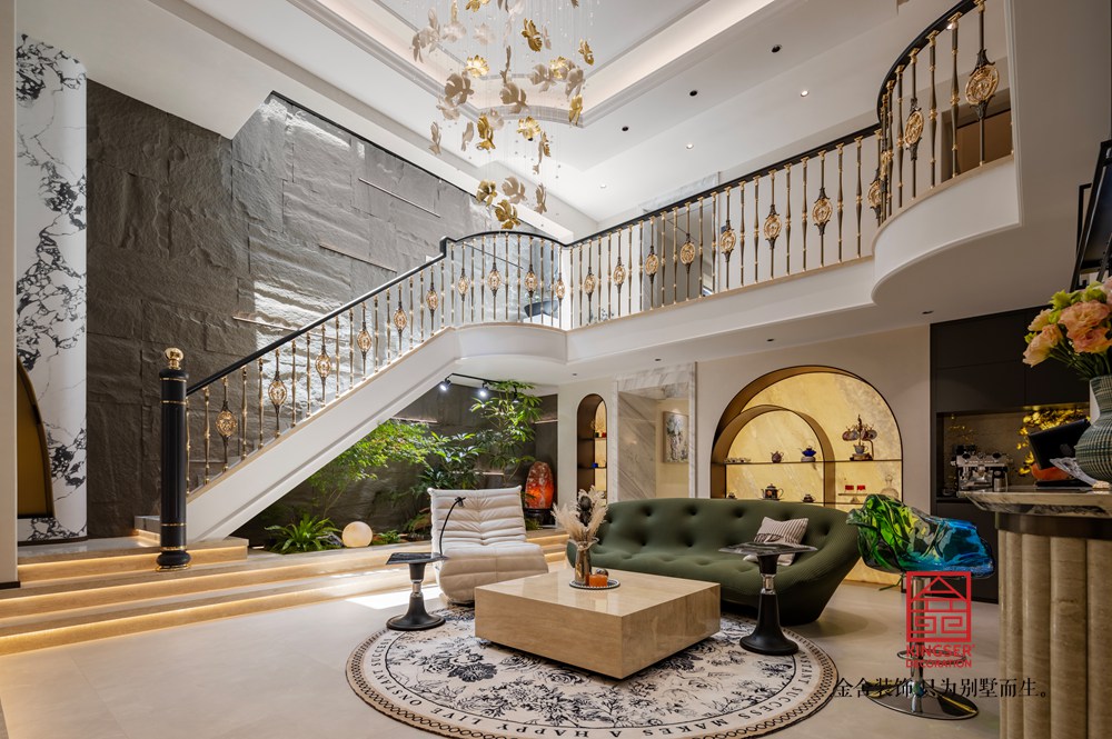 螺旋線條復刻鸚鵡螺自然韻律,金屬扶手勾勒利落光影,石材踏板沉淀溫潤質感。剛柔碰撞間,讓樓梯不止是通行空間,更成為家居里自帶焦點的藝術裝置。