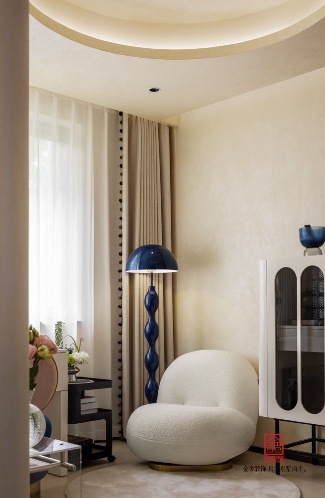 一樓空間以奶油白,深灰藍,香檳金,三種主色交織出溫柔治愈的基底。
