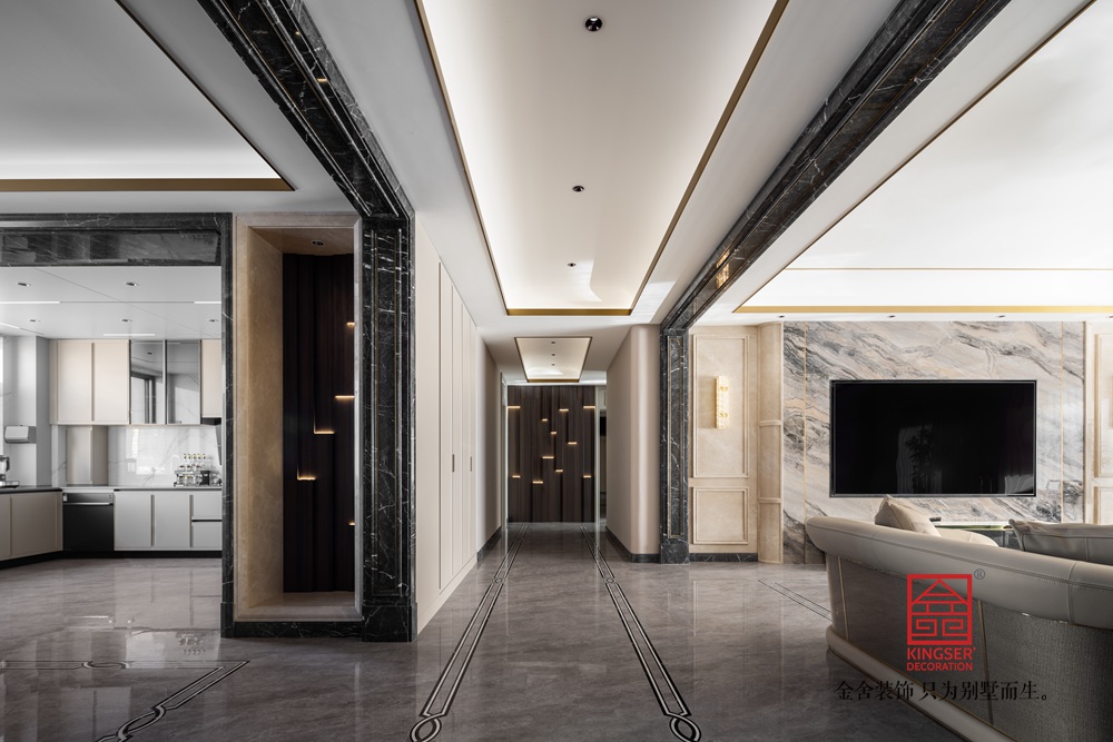 玄關部分以港式輕奢風為基調,營造精致入戶儀式感。深灰色大理石感地面通鋪,柔和的光線將整個空間凸顯入戶的精致。