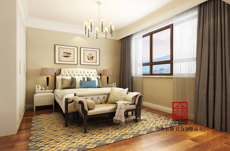 考慮到臥室的休息性,在色調(diào)上采用了淺灰色作為背景墻的主色調(diào),即溫和又不會(huì)顯得沉悶,有助于提高業(yè)主的睡眠質(zhì)量。經(jīng)典的美式“三段式”’造型,沒(méi)有過(guò)多復(fù)雜邊線,簡(jiǎn)潔干練,搭配頗有現(xiàn)代感的金屬燈飾及飾品,使整個(gè)空間簡(jiǎn)而不失潔時(shí)尚。整體的方案圍繞清新的美式風(fēng)格的簡(jiǎn)單舒適,質(zhì)樸典雅來(lái)設(shè)計(jì),完美詮釋了業(yè)主的提出的“簡(jiǎn)潔而不簡(jiǎn)單”的沒(méi)事風(fēng)格,也體現(xiàn)了業(yè)主對(duì)高品質(zhì)生活的要求。
