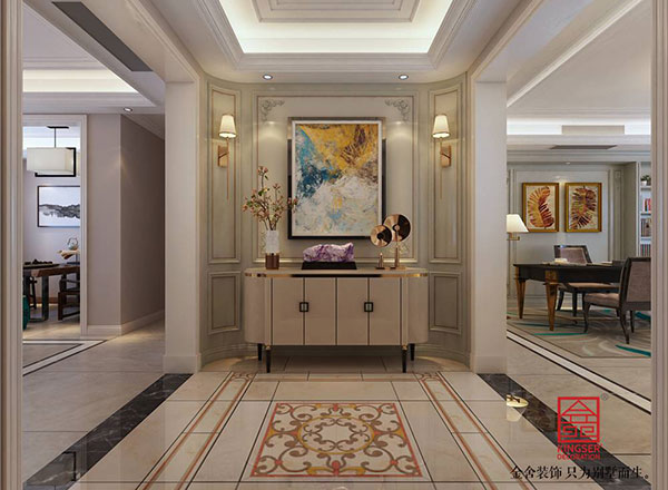 設計說明:此案例為石家莊金舍裝飾-榮盛華府200平米混搭風格裝修效果圖。傳統的客廳以電視墻為主導,沙發和茶幾的高度往往相差不大,這樣的高度差對于孩子寫作業或是成年人看書寫字和使用電腦是沒有舒適度可言的,因此一些有工作和學習需求的家庭可以考慮把家庭工作室融入客廳,利用靠墻的大操作臺和各種墻面擱板架,滿足多人工作的需求
