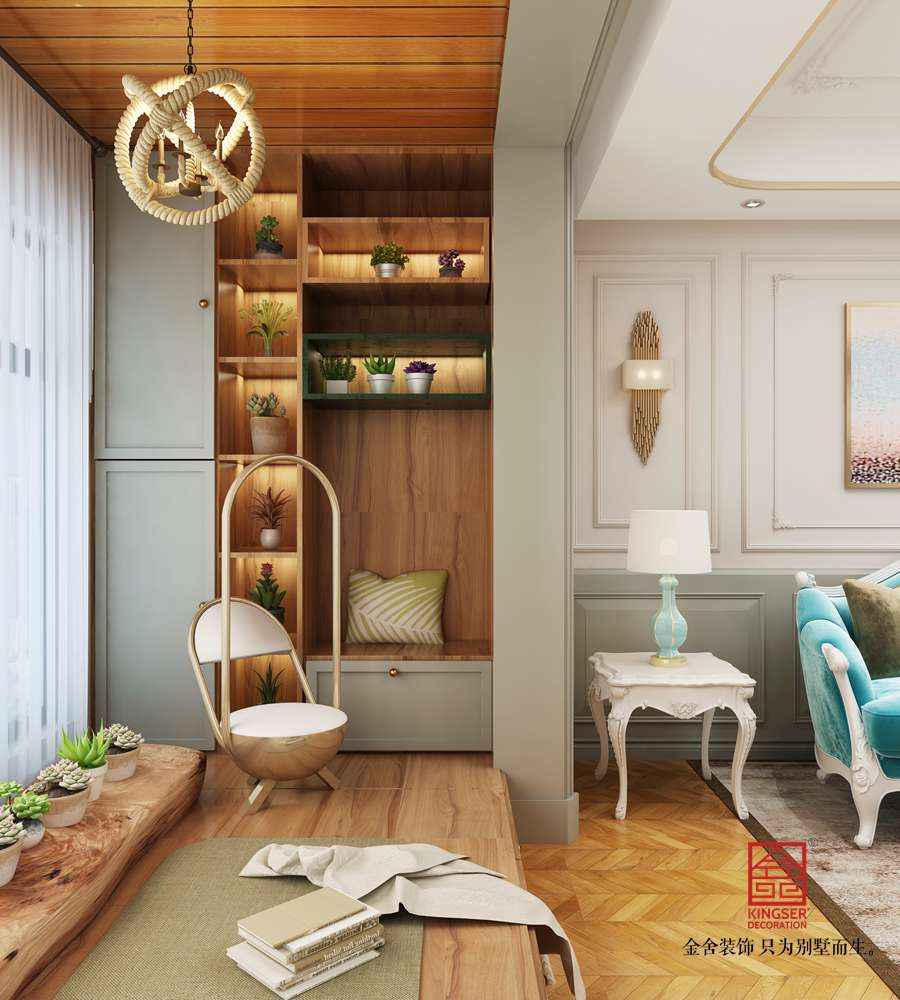 設計說明:此案例為石家莊金舍裝飾-東南智匯城126平米法式輕奢風格裝修效果圖。藍色系具有立體感的沙發顏色,使墻面很顯層次感;多彩的地毯、靈動設計的臺燈、不拘一格的掛畫,營造出一幅自由、溫馨、浪漫的氛圍;而客廳旁的落地窗給足了這間空間明亮的自然采光,用餐區域餐桌上方的水晶吊燈與客廳中的精致吊燈遙相呼應,讓整個空間之中都映射出一種浪漫氛圍,法式風格如同法國這個國家一樣,浪漫迷人,仿佛普羅旺斯的陽光,灑滿你的家。藍色調營造浪漫時尚法式風情,尋求心靈的自然回歸感;將法式傳統的三顏色與當季流行色融合,不失法式的貴氣和浪漫