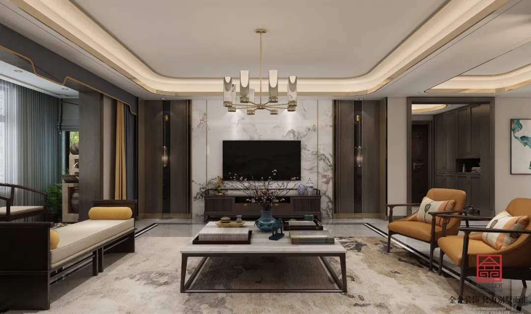 客廳在主色調、格局、細節方面,微微幾筆勾勒出“只緣身在此山中”中式韻味。在中式與現代元素的博弈中,恰當取舍,無論是談笑鴻儒還是往來白丁,都能泰然自處。