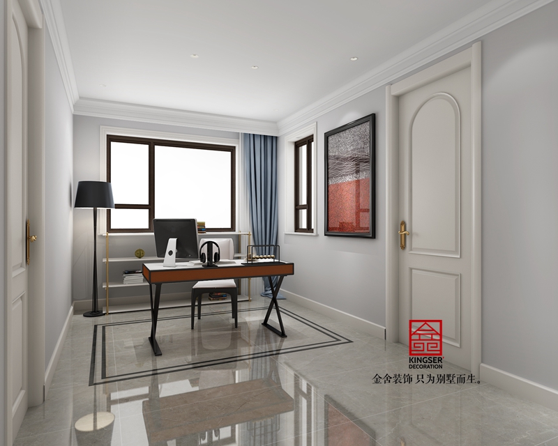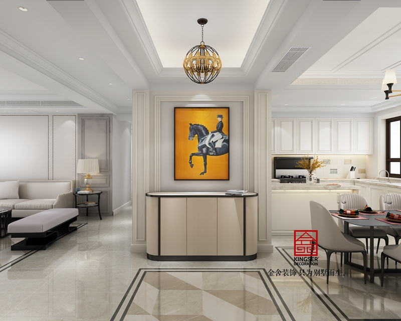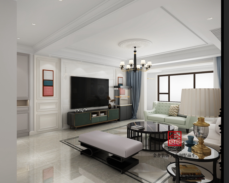 -榮盛華府185平米美式休閑風格裝修效果圖。它就猶如一個歡快的年輕人,輕快的走在田間小路上,它散發著陽光的溫暖與青草的幽香,讓人們體會到最簡單本質的快樂。整個設計作品采用莫蘭迪色系,營造出一個清晰文藝的休閑空間。置身客廳,以米白色為基調,淺米白亮色硬包雅灰色木飾面帶來舒適靜心的視覺感受,淡綠色布藝沙發與天藍色窗簾對應承接,來表現空間獨有的意識形態。