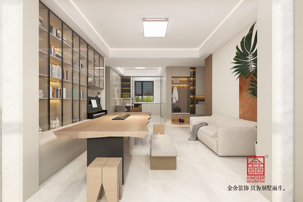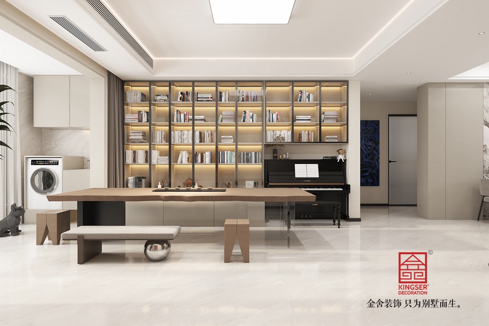 此空間采用去客廳化設計,打破傳統(tǒng)客廳單一社交功能的局限,打造出集閱讀、藝術、休閑等多元體驗于一體的復合區(qū)域。 整面玻璃書柜兼具收納與展示功能,暖光加持下,書籍仿若藝術品,營造出靜謐的閱讀氛圍。原木長桌造型獨特,成為空間核心,可滿足閱讀、手工等多樣需求,搭配簡約座椅與長凳,為互動交流提供靈活場景。鋼琴的融入,為空間注入藝術氣息,讓居者能隨時沉浸于音樂世界。