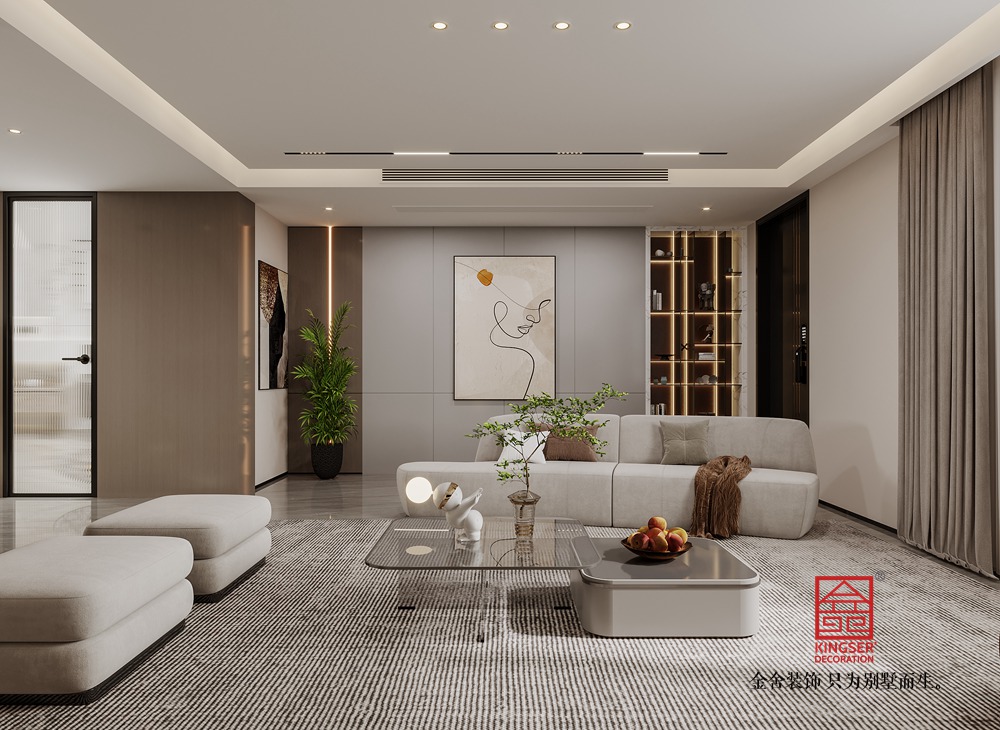 該別墅客廳設(shè)計遵循現(xiàn)代輕奢與極簡融合的思路。整體色調(diào)選取低飽和度的暖棕、米白等,構(gòu)建出雅致柔和的基底。大面積的墻面采用簡潔的板材設(shè)計,干凈利落,與嵌入其中的電視及兩側(cè)帶有燈光點綴的收納格相配合,既滿足實用需求,又通過光影變化營造出輕奢氛圍。