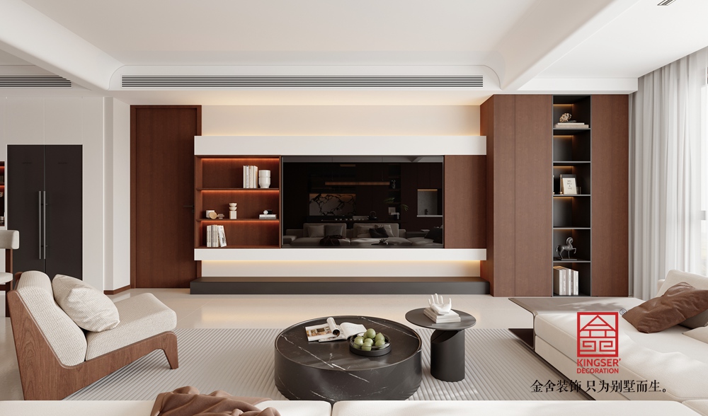 該客廳設(shè)計以現(xiàn)代簡約為核心,融合自然溫馨的質(zhì)感。空間以淺色調(diào)為基礎(chǔ),搭配深棕色木質(zhì)柜體,營造出和諧且富有層次的視覺效果。
